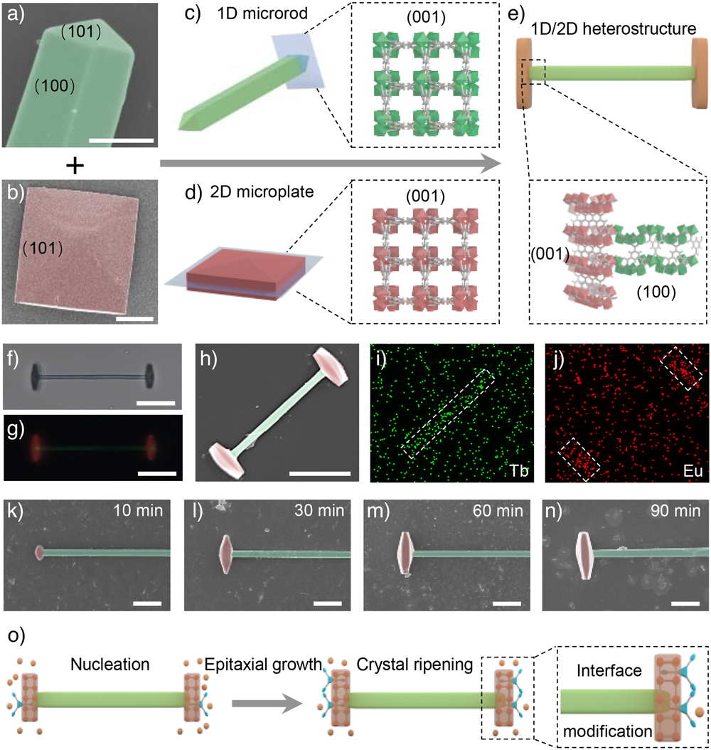 针对上述瓶颈,高振华教授课题组提出了一种创新性的“晶面选择性成核”策略。该方法通过精确调控不同晶面的成核势垒,有效突破了跨维度外延生长的限制,实现了二维MOF模块在一维MOF微米棒特定晶面上的区域选择性生长,成功构筑了一系列构型高度可编程的多维MOF异质结构。研究人员利用Ln-MOF微米棒顶端晶面固有的高表面能特性,选择性诱导二维(2D)MOF微米片在棒体顶端成核与外延生长,成功构筑了结构与性能可调的哑铃状异质结构(图1)。在此基础上,为进一步突破单一顶端生长模式的限制,研究人员引入乙醇作为双功能表面调控剂。乙醇分子优先吸附于微米棒侧壁晶面,有效调节局部溶剂化环境并显著降低侧壁成核势垒,从而实现了次级生长位点由顶端向侧壁的可控转移,诱导二维模块沿一维棒体方向周期性排列,形成具有高度有序特征的串珠状异质结构。