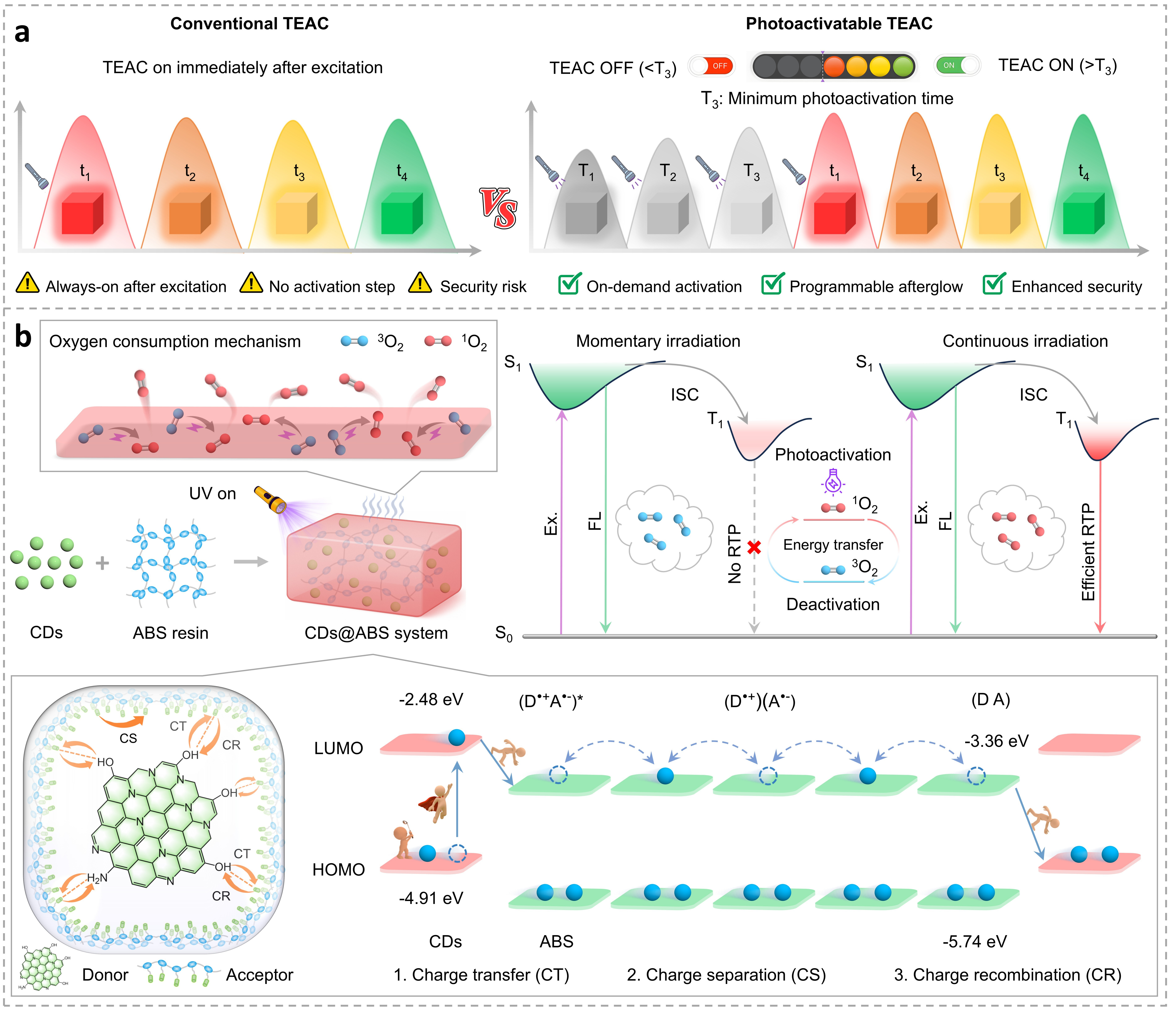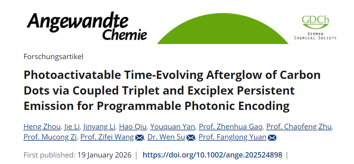 论文信息:Photoactivatable Time-Evolving Afterglow of Carbon Dots via Coupled Triplet and Exciplex Persistent Emission for Programmable Photonic Encoding DOI: 10.1002/anie.202524898