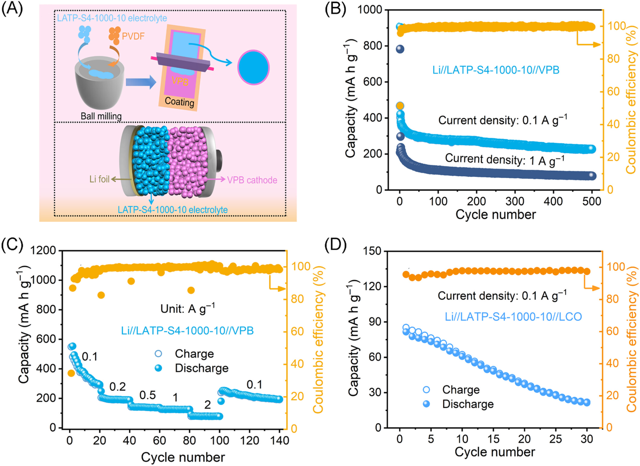 图3.“玻璃态锂离子电池”的制备及其电化学性能。(A)全固态玻璃态电池结构示意图。(B)Li//LATP-S4-1000-10//VPB玻璃态电池分别在0.1和1 A·g-1电流密度下的长循环性能。(C)Li///LATP-S4-1000-10//VPB玻璃态电池分别在0.1、0.2、0.5、1、2和0.1 A·g-1电流密度下的倍率性能。(D)Li//LATP-S4-1000-10//VPB固态电池在0.1 A·g-1下的循环性能。