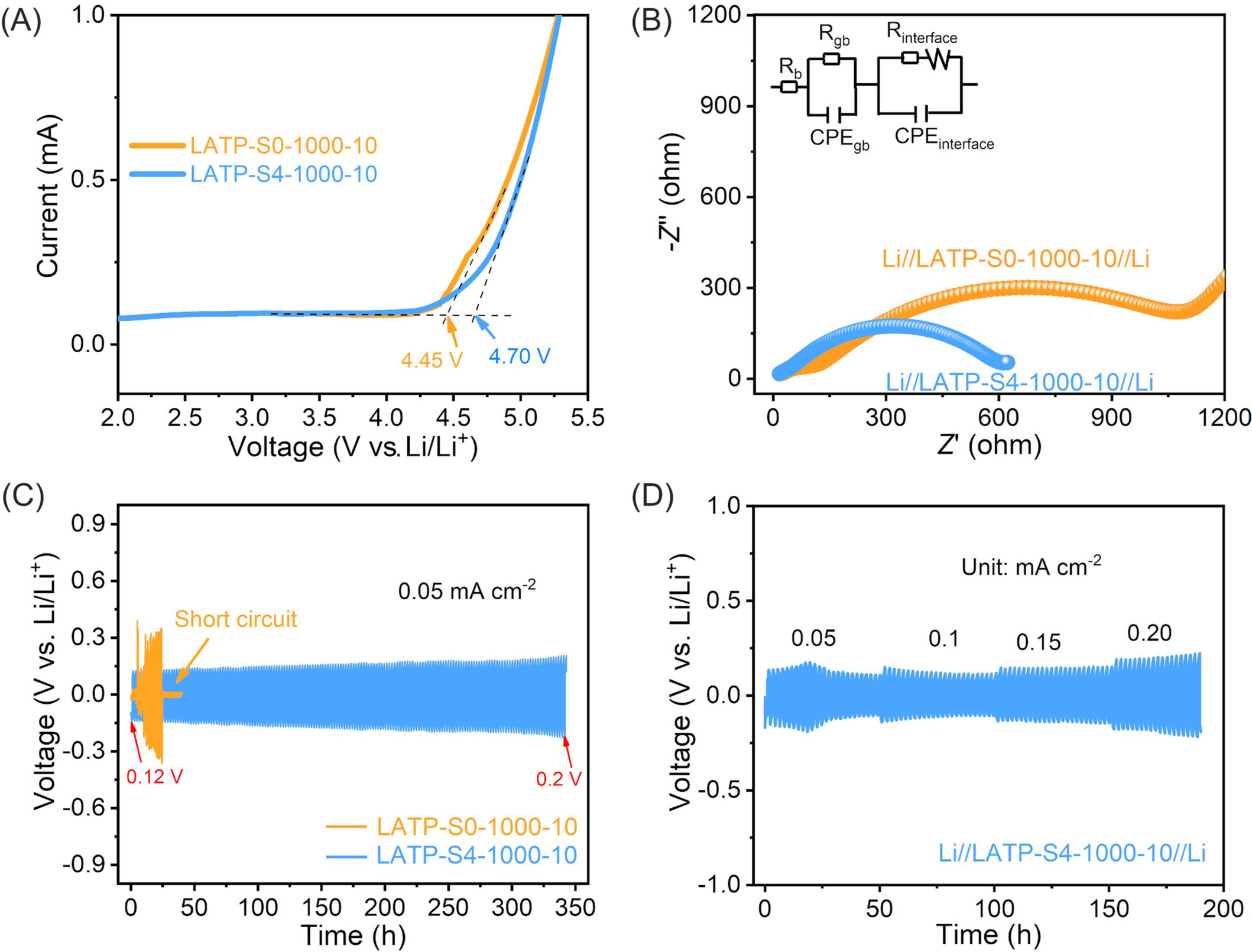 图2. LATP-S0-1000-10与LATP-S4-1000-10电解质的锂沉积/剥离行为对比。(A)LSV曲线,(B)EIS谱,(C)基于LATP-S0-1000-10和LATP-S4-1000-10电解质的Li//Li对称电池恒流循环性能,(D)Li//LATP-S4-1000-10//Li电池在不同电流密度下的时间-电压曲线。