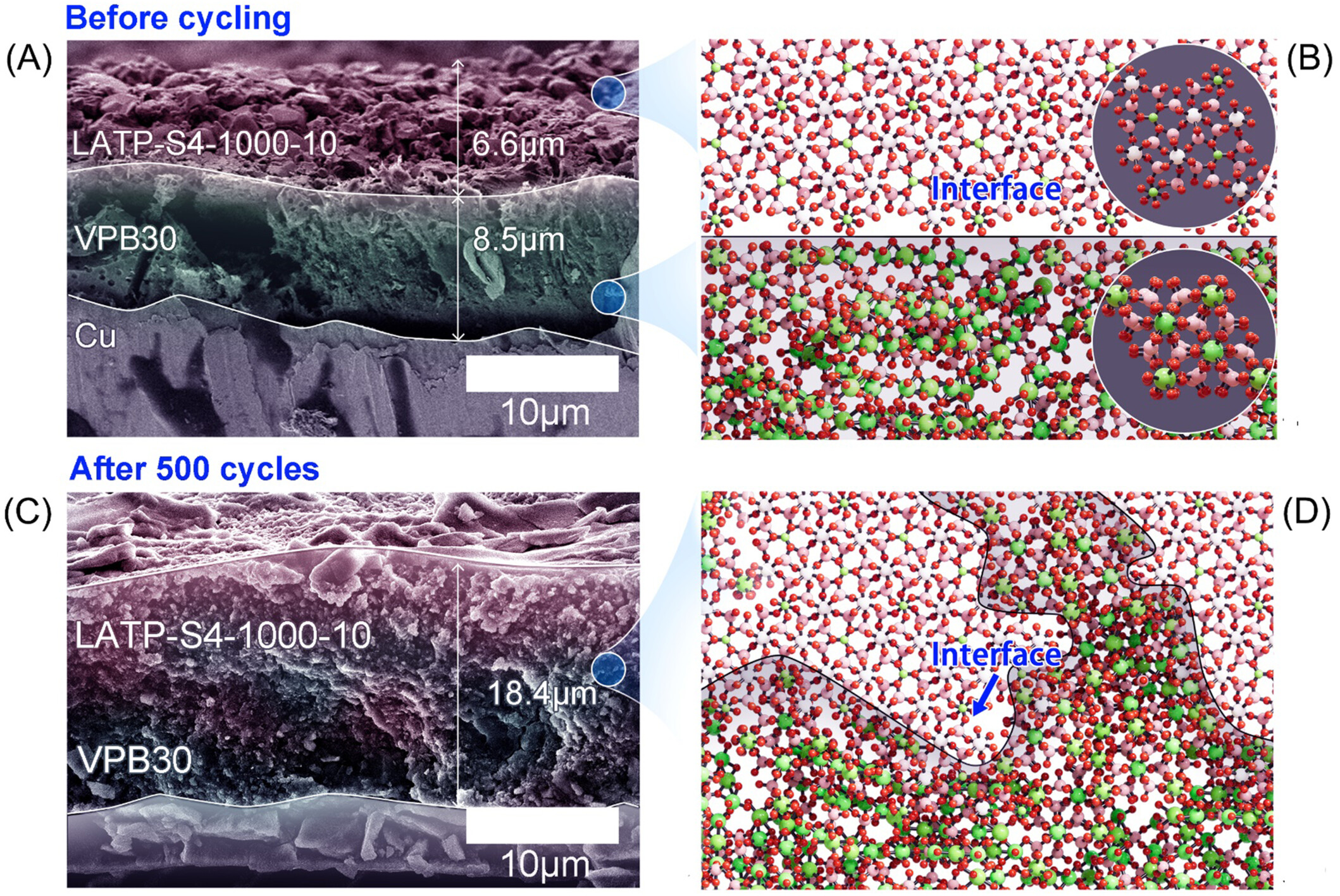 图4. LATP-S4-1000-10电解质与VPB玻璃电极高兼容性界面示意图及充放电循环前后的SEM图像。