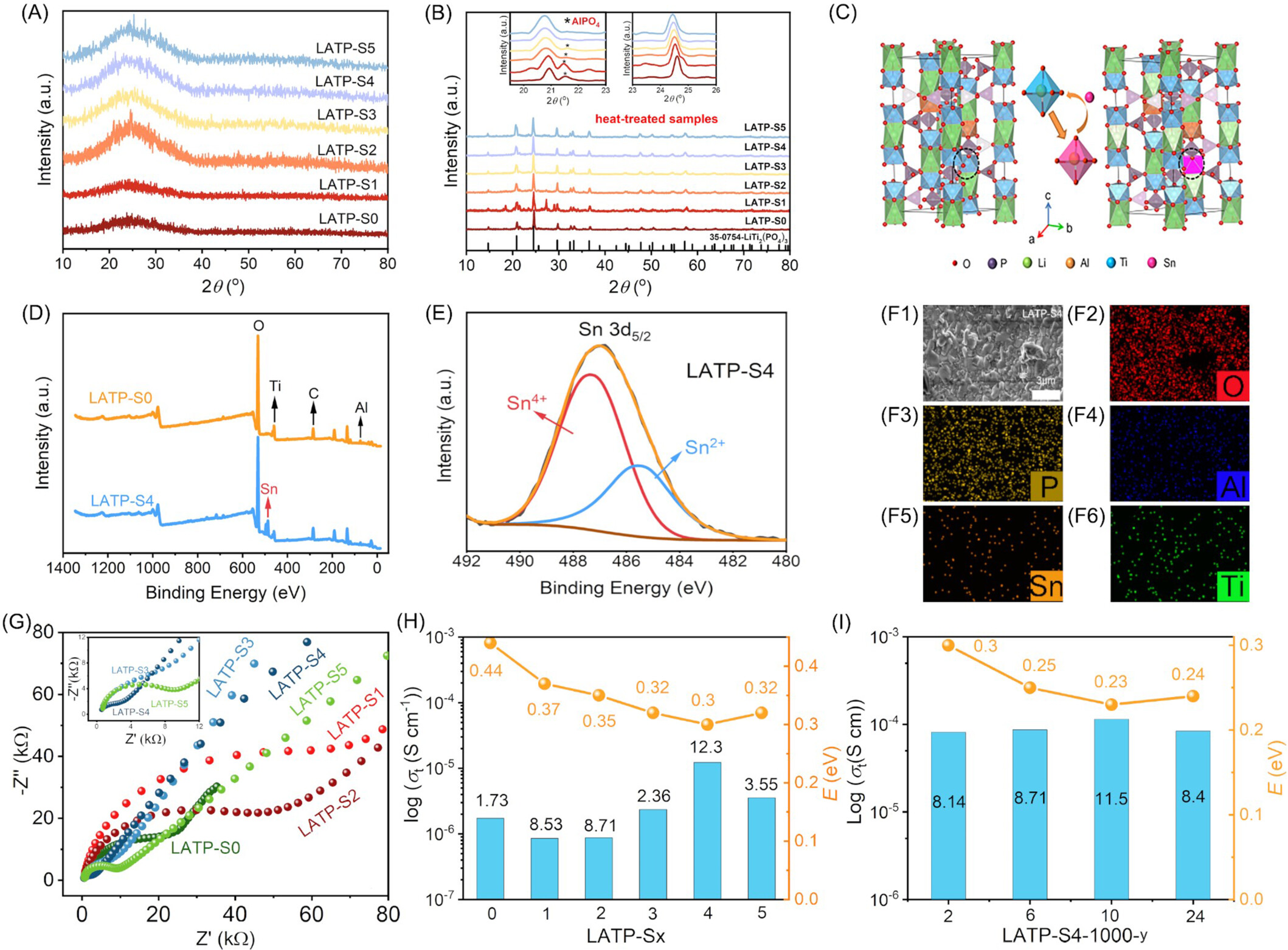 图1. 所制备LATP电解质的结构表征和离子传输性能。(A)LATP-Sx前躯体玻璃的XRD图谱。(B)经900oC热处理2小时LATP-Sx微晶玻璃的XRD图。插图为(104)和(113)晶面衍射峰的局部放大图。(C)Li1.5Al0.5Ti1.5(PO4)3(左)与Li1.5Al0.5SnxTi1.5-x(PO4)3(右)的晶体结构示意图。(D)LATP与LATP-S4的XPS图谱。(E)LATP-S4电解质中Sn 3d5/2的高分辨XPS图谱、(F1)LATP-S4微晶玻璃的SEM图像,(F2–F6)为对应元素分布图。(G)室温下LATP-Sx微晶玻璃的EIS谱。(H)LATP-Sx和(I)LATP-S4-1000-y微晶玻璃的离子电导率与相应的活化能。